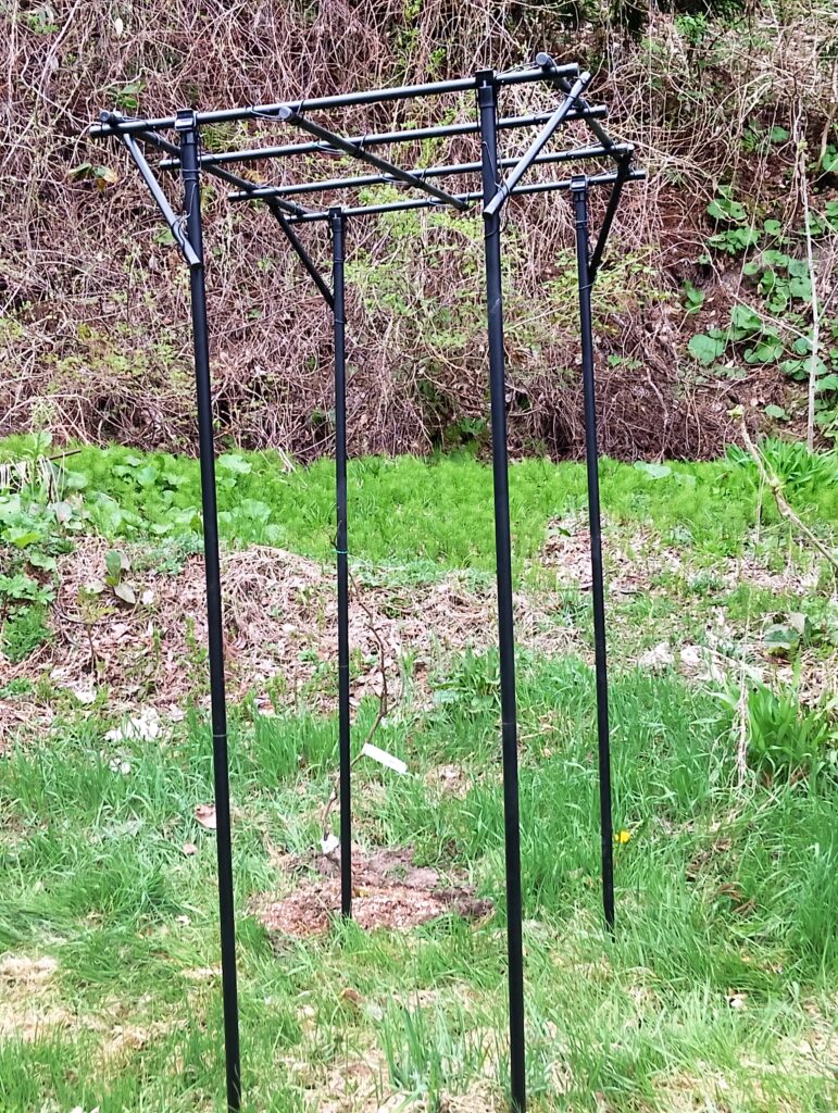 四隅に支柱をしっかり立て、上部にワイヤーを格子状に張ります。この部分につるを広げていきます。